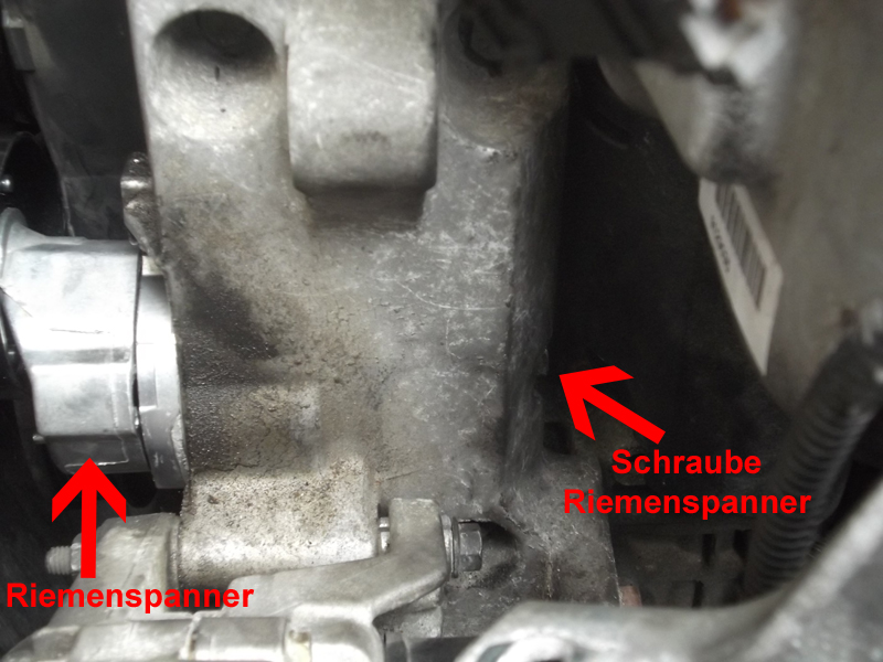 Dadurch habe ich Platz geschaffen um die Schraube zu erreichen die den Riemenspanner hält. Diese drehte ich Stück für Stück raus. Bei Bedarf zog ich diesen nach links weg, da die schraube nicht sehr viel Platz hat, bis ich diesen einfach raus nehmen konnte.